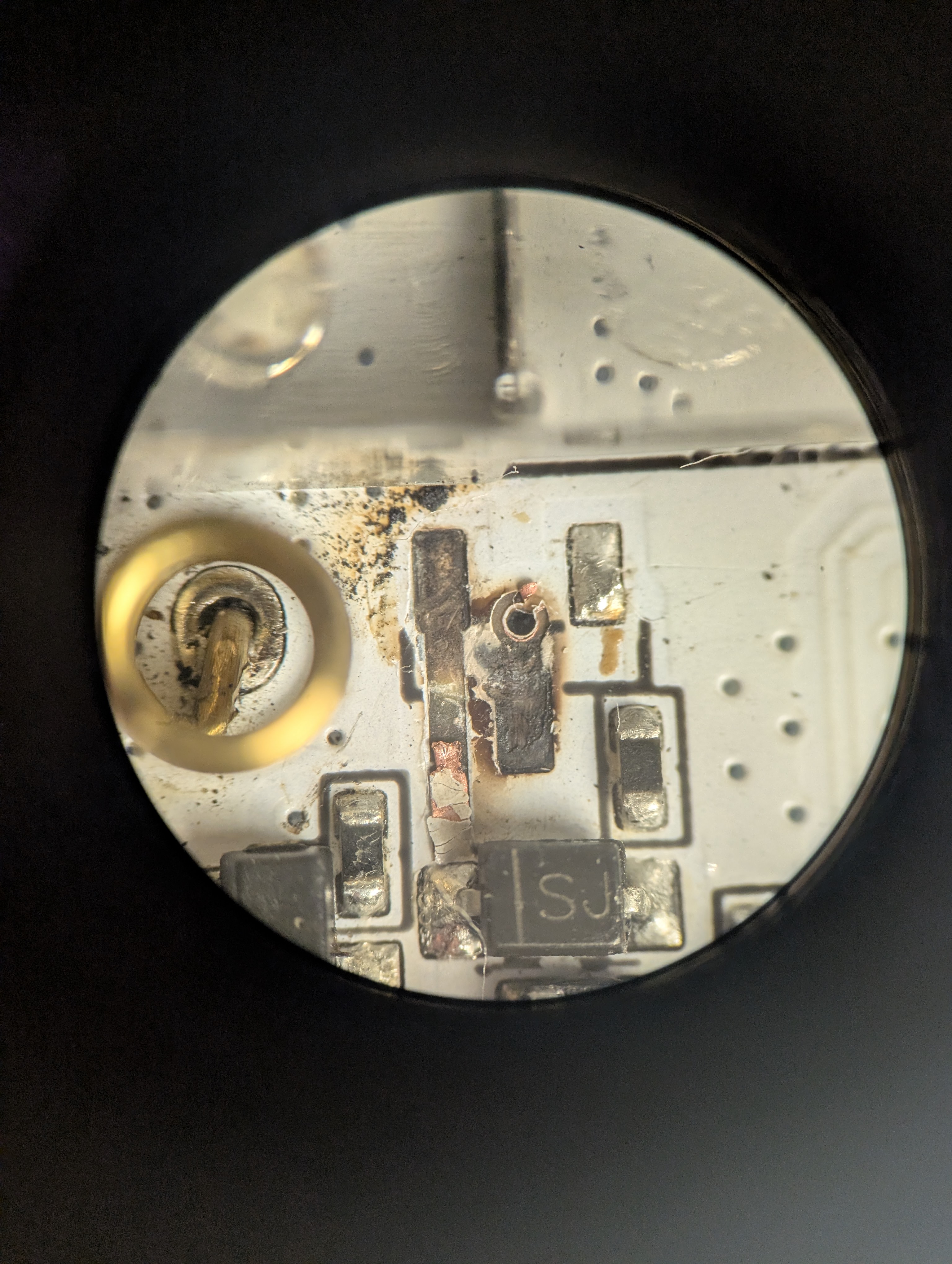 No other components appear heat damaged and the boards power up and function with USB power so I assume that it is something in the LiPo charging / power circuit, but the component is burned/cracked badly enough that I can’t read the markings.