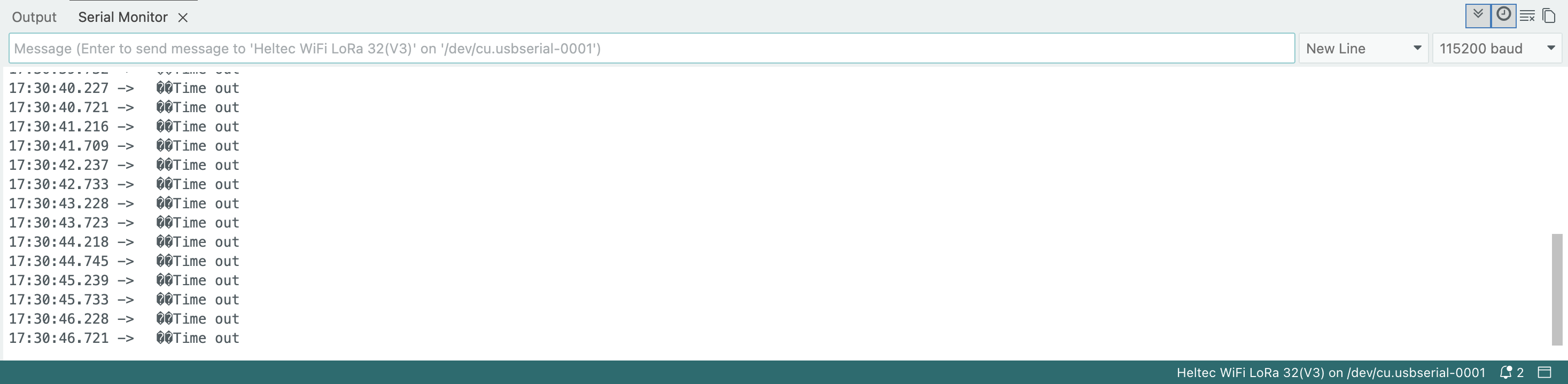 Fig. 1: Serial monitor output showing “??Time out” for the setup with the Heltec MCU.