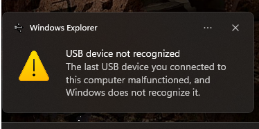 The last USB device you connected to this computer malfunctioned, and Windows does not recognize it.