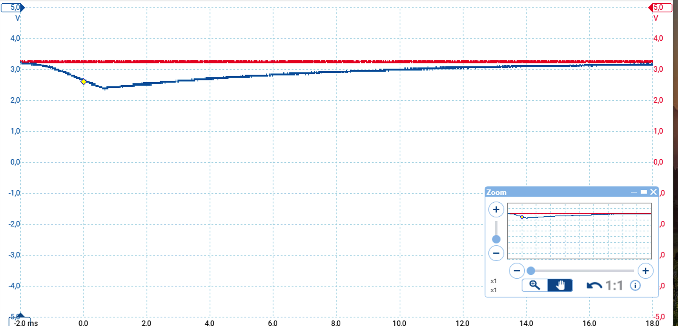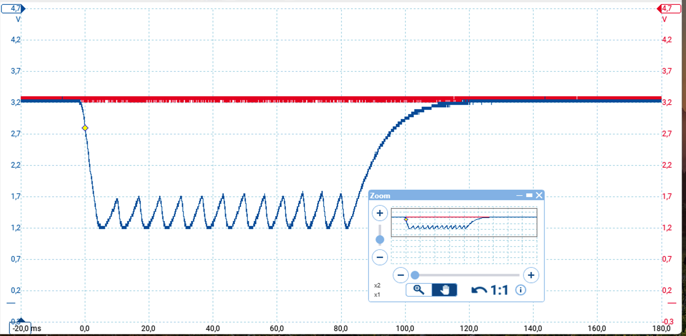 Blue line is CHIP_PU (Reset), red is Vdd 3V3 to prove a stable supply.